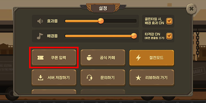 설정 창이 열렸습니다. 화면 왼쪽 중간에 큼지막한 버튼이 보이죠. 쿠폰 입력 버튼입니다. 이제 쿠폰 입력 버튼을 터치하고 카우보이 키우기 쿠폰 코드를 입력해서 보상을 받아보세요. 현재 mobi 앱, ZZi 앱 등 공식 카페에서도 여러가지 쿠폰 코드가 있으니까 모두 등록해서 편하게 초반 플레이를 진행할 수 있습니다.