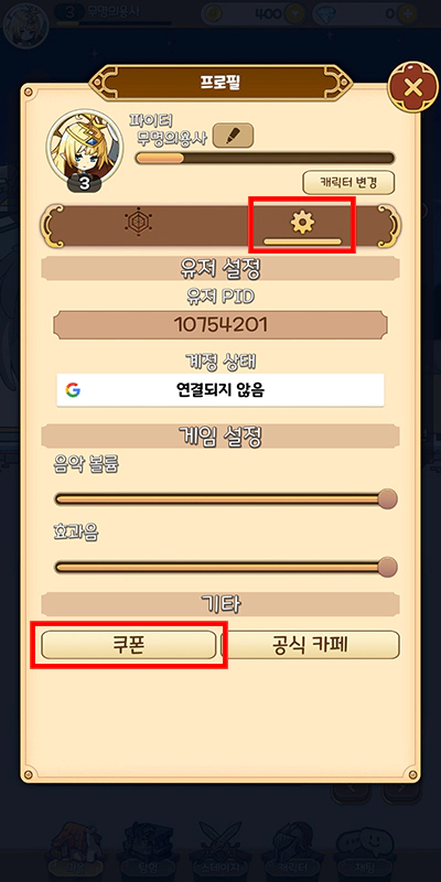 프로필 화면이 열렸어요. 이제 화면 하단을 살펴보시면 쿠폰 버튼이 있는데 쿠폰 버튼을 터치하고 와플 스토리 온라인 쿠폰 코드를 입력해서 보상을 받으시면 됩니다. 현재 공식 카페에서 추가로 입력 가능한 쿠폰 코드를 찾을 수 있으니 보상을 받으실 분들은 카페를 방문해서 확인해보세요.