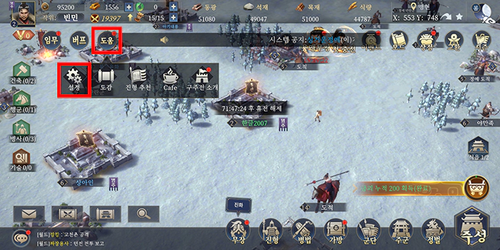 삼국지: 패왕은 전략 게임이라서 튜토리얼을 진행하셔야 합니다. 쿠폰은 튜토리얼을 진행하고 등록해주세요. 먼저 화면 왼쪽 상단에서 도움 버튼을 터치하면 아래로 메뉴가 열리는데요. 왼쪽에 설정 버튼을 터치하시면 됩니다.