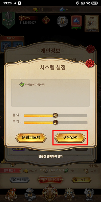 시스템 설정 창이 열렸죠. 창 크기에 비해서 부실한 설정 기능이 눈에 확 띄는군요. 아무튼 쿠폰을 등록하려면 오른쪽 하단 쿠폰입력 버튼을 터치하고 퍼펙트 아레나 쿠폰 코드를 입력해서 보상을 받으세요. 딱 한 분 입력 가능한 원스토어 사전예약 쿠폰 남겨드릴게요. 88n47714 입니다. 먼저 제 포스팅을 확인하신 분이라면 바로 등록해서 보상 받아가세요.
