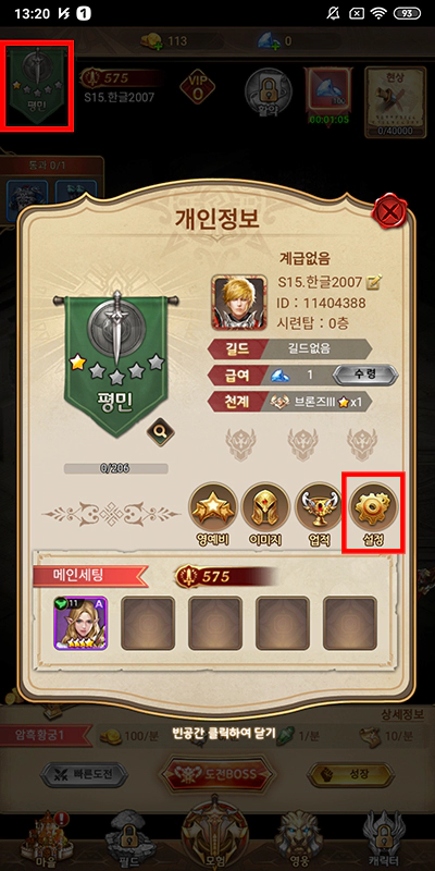 퍼펙트 아레나를 실행합니다. 그리고 바로 쿠폰을 등록하시면 되는데요. 화면 왼쪽 상단 깃발 부분을 터치하면 개인정보 창이 열리는데 오른쪽을 보시면 설정 버튼이 있을거예요. 설정 버튼을 터치해서 설정 창을 열어주셔야 합니다.