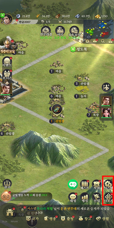 역시나 모바일 전략 게임은 접속하면 튜토리얼이 진행되는군요. 삼국지 2022 게임도 튜토리얼을 진행하셔야 쿠폰 등록이 가능합니다. 쿠폰을 등록하시려면 화면 오른쪽 하단 더보기 버튼을 터치하세요. 그러면 바로 위에 숨어있던 메뉴가 열리는데 시스템 버튼을 터치해서 시스템 창을 열어주시면 됩니다.