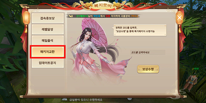 복지 창이 열렸어요. 화면 왼쪽을 보시면 패키지 교환 버튼이 있죠. 패키지 교환 버튼을 터치하고 오른쪽에 강호귀환 쿠폰 코드를 입력해서 보상을 받아보세요. 지금 구글 플레이 게임 설명이나 강호귀환 로딩 화면에서 계속 알려주고 있는 쿠폰 코드가 있죠. 바로 life01입니다. 그리고 제가 원스토어에서 받은 쿠폰 코드도 남겨놓을게요. g759aizegmvx76gt입니다.