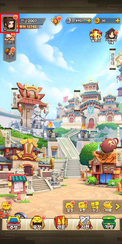 삼국지 러쉬 Origins는 처음 등록하게 되면 튜토리얼 플레이를 해주셔야 합니다. 쿠폰은 튜토리얼이 완료된 이후에 등록할 수 있어요. 이제 쿠폰 등록을 해볼까요? 화면 왼쪽 상단 프로필 이미지를 터치하세요.