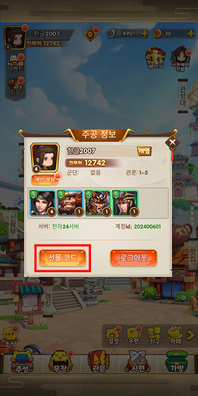 화면 가운데 주공 정보 창이 열렸습니다. 쿠폰 등록은 주공 정보 창 화면 왼쪽 하단 선물 코드를 터치하면 등록할 수 있어요. 선물 코드 버튼을 터치하고 삼국지 러쉬 Origins 쿠폰 코드를 입력해서 보상을 받아보세요. 마지막으로 제가 원스토어에서 받은 코드 적어놓도록 하겠습니다. dSKuJC6pinHe입니다. 사전예약 코드라서 딱 한 분 입력할 수 있어요.