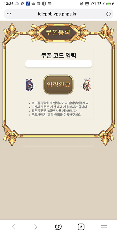 야가다 왕국은 게임 화면에서 쿠폰 코드를 입력하는 창이 열리지 않고 모바일 브라우저에 야가다 왕국 쿠폰 코드를 입력하는 페이지로 접속됩니다. 서버는 없으니 선택하는 화면도 당연히 없고 보통 유저 ID를 입력하는 경우가 있는데 야가다 왕국은 쿠폰 코드만 입력하면 보상을 받을 수 있네요.