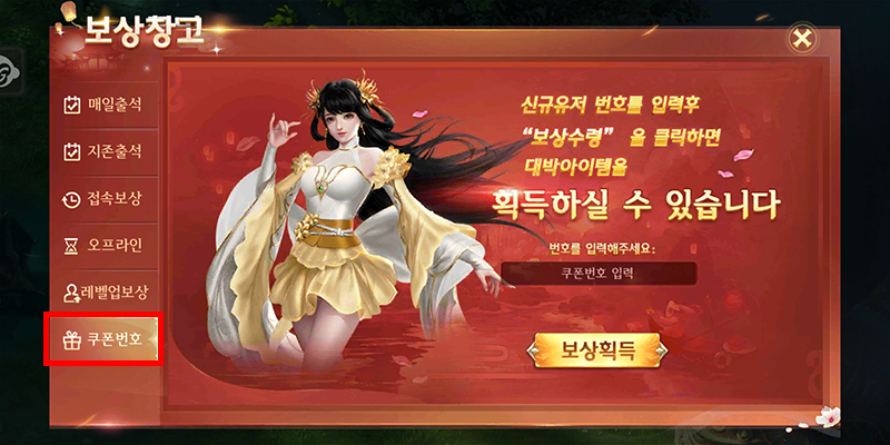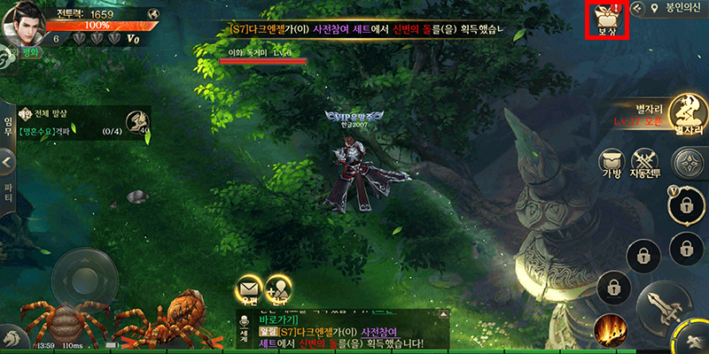 게임을 처음 실행하시면 알아서 자동 전투를 진행하는데요. 물론 처음부터 쿠폰은 등록할 수 없습니다. 그래도 알아서 전투를 진행하면서 성장을 하니까 잠깐 물 한잔 마시고 오면 화면 우측 상단에 보상 버튼이 나와요. 쿠폰 등록은 보상 버튼을 터치하셔야 합니다.