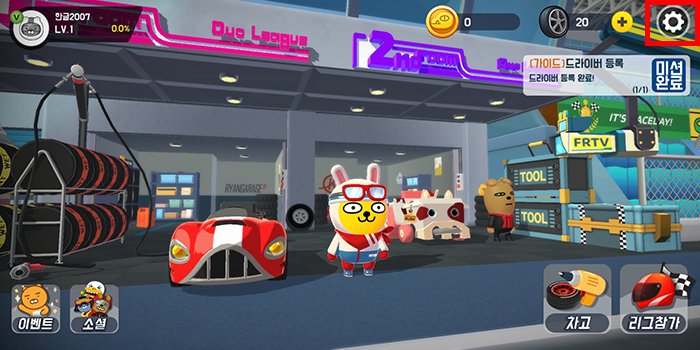 프렌즈레이싱 듀오는 접속했을 때 튜토리얼을 진행할 것인지 그냥 시작할 것인지 선택할 수 있습니다. 아무래도 처음 시작하는 게임이니까 튜토리얼은 진행하는 것이 좋을 것 같아요. 그리고 메인 화면으로 넘어오시면 오른쪽 상단 톱니바퀴 버튼을 터치해서 설정 화면을 열어주시면 됩니다.