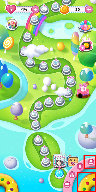 캔디팡은 퍼즐형 게임이지만 튜토리얼 없이 바로 쿠폰 등록이 가능합니다. 등록할 수 있는 쿠폰이 있다면 화면 오른쪽 하단 도넛 버튼을 터치해서 메뉴를 열어주시고 사람 모양이 그려진 버튼을 터치하세요.